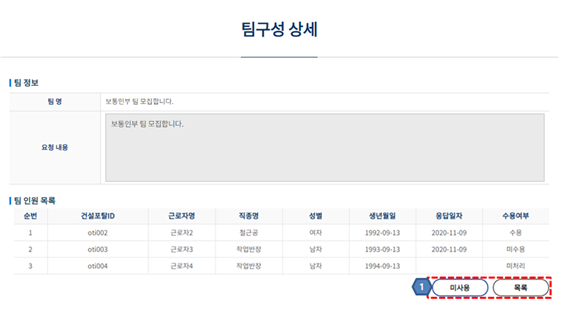 ① 팀 인원 중 한명이라도 수용한 경우, 미사용/사용 버튼이 활성화되며 미사용/사용 버튼을 클릭하면 해당그룹을 미사용/사용 처리한다. 목록버튼을 클릭하면 그룹구성 관리 화면으로 이동한다.