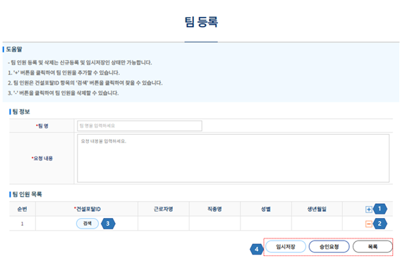 ○ 화면 위치 : 일자리정보 > 팀구성 > 팀구성 관리 > 팀 등록 상세